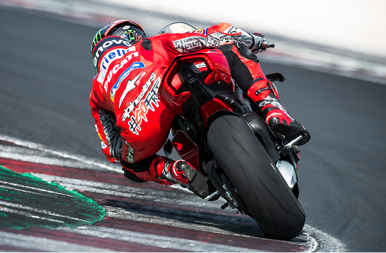 V4 90° equipado com o Desmosedici Stradale, de 1.103 cm3 (inclinado 42° para trás na horizontal).